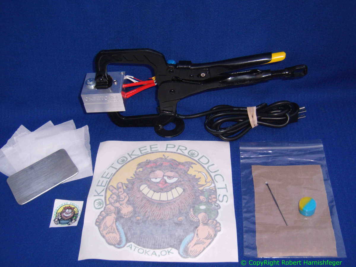 @1.5 Amp. 2" X 2.5" X 3/4" Aluminum plates. Built in thermostat.. 230 Deg. F. fixed temp setting. Plates attatch directly to grips with bolts for ez adjustments. 1200 PSI..aprox. Adjustable to produce highest yields Perfect for the home users pressing 1 to 1 1/2 grams at a time. A pollen press is recomended but not required. Easy to use for those with arthritic hands. Truely plug n play, just 3 to 5 mins. to max temp. Indicator light to show the plates in heating mode. Indicator light goes off when max temp is reached. 3 times larger than exsisting press's of simalar design. Easily transport this press wherever you go. Completely Solventless extraction. Comes as a complete kit.. All you need is the material to process. More value for your hard earned money. Click these to see it in action.. Vid 1 Vid 2 Vid 3 Vid 4 Contents: Suggested retail @ just