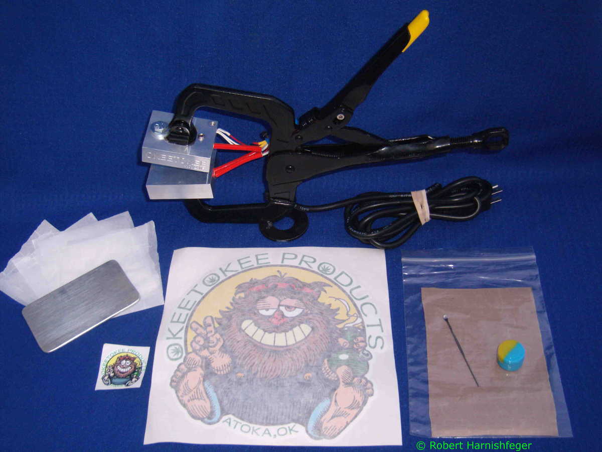 @1.5 Amp. 2" X 2.5" X 3/4" Aluminum plates. Built in thermostat.. 230 Deg. F. fixed temp setting. Plates attatch directly to grips with bolts for ez adjustments. 1200 PSI..aprox. Adjustable to produce highest yields Perfect for the home users pressing 1 to 1 1/2 grams at a time. A pollen press is recomended but not required. Easy to use for those with arthritic hands. Truely plug n play, just 3 to 5 mins. to max temp. Indicator light to show the plates in heating mode. Indicator light goes off when max temp is reached. 3 times larger than exsisting press's of simalar design. Easily transport this press wherever you go. Completely Solventless extraction. Comes as a complete kit.. All you need is the material to process. More value for your hard earned money. Click these to see it in action.. Vid 1 Vid 2 Vid 3 Vid 4 Contents: Suggested retail @ just